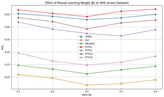 As shown in Figure 6, the mutual learning weight is selected from {0.1, 0.3, 0.5, 0.7, 0.9}. We analyze the influence of different mutual learning weights. The model exhibits the worst performance when or . A high value of indicates that the weight assigned to the mutual learning loss is insufficient, weakening the knowledge exchange between networks and consequently degrading the prediction performance. On the contrary, a low value of indicates that the mutual learning loss is overemphasized, while the supervision from the ground truth (hard labels) is underweighted, which significantly compromises the model’s predictive performance. When , both networks contribute complementary information, and the model achieves its best predictive performance.