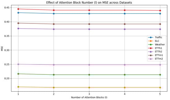 As shown in Figure 7, the number of attention blocks is selected from {1, 2, 3, 4, 5}. The impact of the number of attention blocks on performance can be observed. Overall, the model exhibits low sensitivity to changes in layer depth, with two or three layers generally enough to achieve strong performance. However, increasing the network depth also leads to higher computational costs and greater difficulty in convergence. Considering training cost and model performance, we choose 2 as the number of attention blocks.