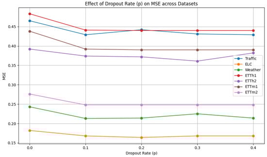 As shown in Figure 8, the dropout proportion is selected from {0.0, 0.1, 0.2, 0.3, 0.4}. We can observe the change trend of dropout proportion . Most datasets perform better at a lower dropout rate (such as 0.1 or 0.2), indicating that an excessively high dropout rate may introduce excessive information loss. To simplify the parameter selection challenge, we adopt a dropout proportion of 0.1.