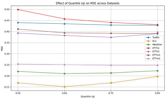 As shown Figure 9, the quantile is selected from {0.55, 0.65, 0.75, 0.85, 0.95}. The quantile parameter in the Denormalizer Module enables the TKDF to better adapt to data drift, particularly in the presence of anomalies within the sliding window. However, higher quantile values may cause the TKDF to become overly sensitive to magnitude variations, reducing its robustness to outliers. In contrast, lower quantiles may limit the TKDF’s ability to capture distributional changes, thereby impairing its adaptability to data drift. We can observe that the performance around is better on almost all datasets, supporting the rationality of setting .