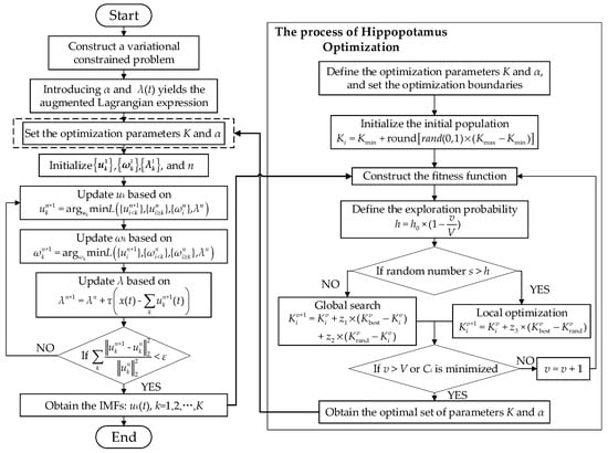 VMD has been widely applied in fault diagnosis due to its strong noise immunity and ability to suppress mode mixing. However, its decomposition performance is highly dependent on the selection of the mode number and penalty factor, necessitating the use of appropriate optimization algorithms for parameter tuning [28]. The HO algorithm, inspired by the foraging behavior of hippopotamuses, achieves a balance between global and local searches, offering fast convergence and strong robustness. Therefore, this paper integrates HO with VMD to realize adaptive decomposition and denoising of fault current and vibration signals. The algorithmic procedure is as follows.