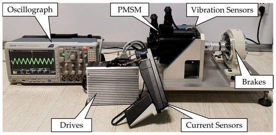 As shown in Figure 2, the experimental platform consisted of three subsystems: a power supply system, a drive system, and a data acquisition system. The motor used in the experiments was a surface-mounted permanent magnet synchronous motor with eight poles and thirty-six slots rated at 1.5 kW. A magnetic powder brake was used to apply and control the load on the motor. The data acquisition system included a BSZ800D-16 vibration collector, a TCP303 current probe, and an oscilloscope, enabling synchronous acquisition of both vibration and stator current signals.