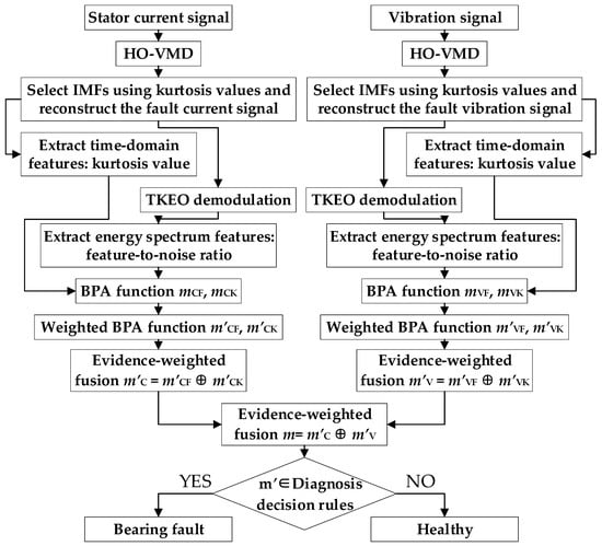 The proposed early bearing fault diagnosis method based on HO-VMD and weighted evidence fusion of current–vibration signals fully leverages the adaptive parameter optimization capabilities of HO-VMD for denoising and decomposing bearing fault signals. Multi-source features are then extracted using the TKEO, and information fusion as well as fault state diagnosis are achieved using the WMDST. The specific diagnostic procedure is as follows: