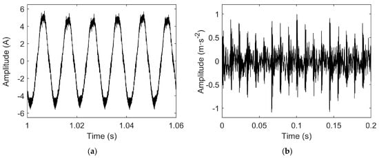 To validate the effectiveness of the proposed early bearing fault diagnosis method, current and vibration signals were sampled under no-load experimental conditions for a motor with an outer race bearing fault. The time-domain waveforms of the sampled fault signals are shown in Figure 5.