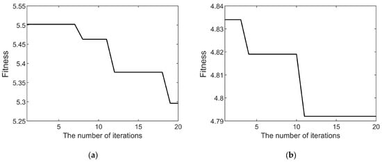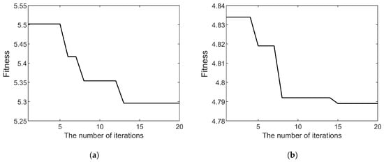 (a) PSO algorithm fitness curve of decomposition parameters for fault current signal; (b) PSO algorithm fitness curve of decomposition parameters for fault vibration signal.