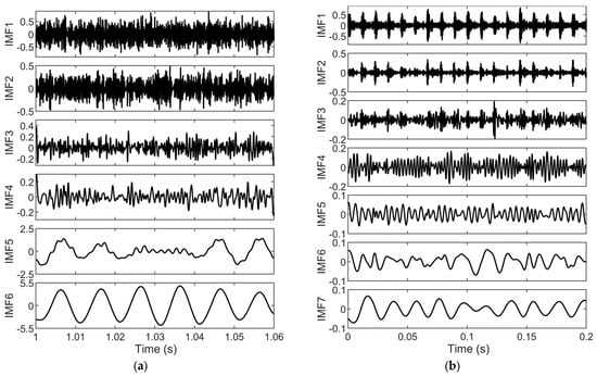 (a) Decomposition results for fault current signal; (b) decomposition results for fault vibration signal.