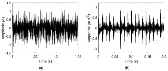 (a) Time-domain waveform of fault current signal; (b) time-domain waveform of fault vibration signal.