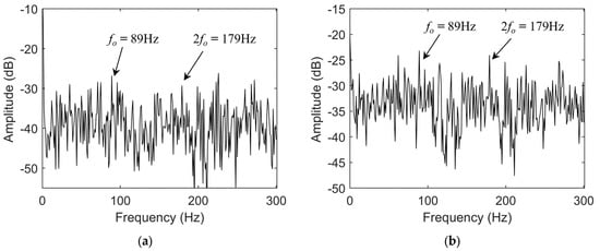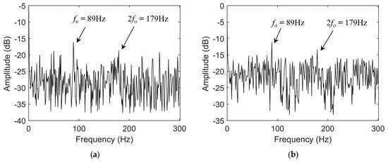 Since the time-domain waveform of the fault signal contains limited fault feature information, it is difficult to accurately determine the existence of bearing faults using only time-domain analysis, whether from current or vibration signals. Therefore, spectral analysis is necessary to extract key characteristic components. As a commonly used demodulation method, the Hilbert transform can effectively highlight the fault features in the spectrum. Figure 10 presents the Hilbert envelope spectra of the reconstructed current and vibration signals, where the arrows indicate the characteristic fault frequency of the bearing outer race and its second harmonic. The Hilbert transform demodulates the modulated fault components in the current signal, so the envelope spectrum exhibits the fault characteristic frequency.