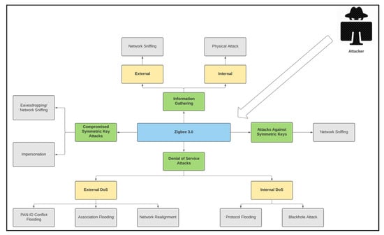 - Kumar, M.; Yadav, V.; Yadav, S.P. Advance comprehensive analysis for Zigbee network-based IoT system security. Discov. Comput. 2024, 27, 22. [Google Scholar] [CrossRef]