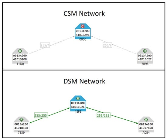 These two configurations were selected because they represent the two security models outlined in the Zigbee 3.0 specification and reflect real-world deployment scenarios. CSM is commonly used in settings where stronger, centralised trust management is needed, such as healthcare. On the other hand, DSM is more suitable for flexible or low-power deployments where centralised management is not feasible. By including both models, we were able to evaluate how security mechanisms, particularly those related to key distribution and trust, perform under differing operational conditions and explore what Zigbee 3.0 offers. Other aspects of the network configuration were held constant to ensure controlled and meaningful comparison between the two models. Additionally, to ensure consistency across experiments, a common ‘base configuration’ was applied to the testbed networks. This included enabling key security features recommended by Zigbee 3.0, such as encryption and device authentication. However, default values were retained for certain configurable parameters when they reflected realistic out-of-the-box deployments or allowed us to focus on the impact of the specific security model being tested. This approach ensured that the comparison between CSM and DSM configurations remained focused on differences in trust and key management, without introducing variability from unrelated protocol settings.