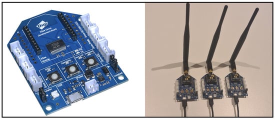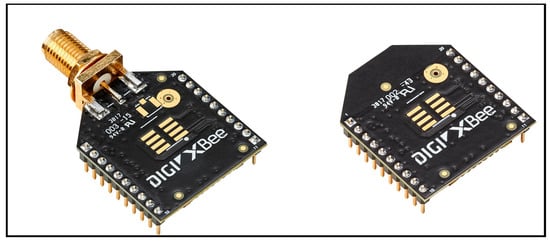 - XBee 3 modules: A total of five XBee 3 Pro (XB3-24Z8ST) and three XBee 3 (XB3-24Z8PT-J) modules were used. These radio modules allowed the supported hardware to operate as coordinator, router, or end device nodes through the configured Application Programming Interface (API) mode. The XBee 3 modules are integrated with the ZigBee 3.0 protocol and operate on the ISM 2.4 GHz frequency, ensuring compatibility with several third-party devices. XBee 3 modules are shown in Figure 3.