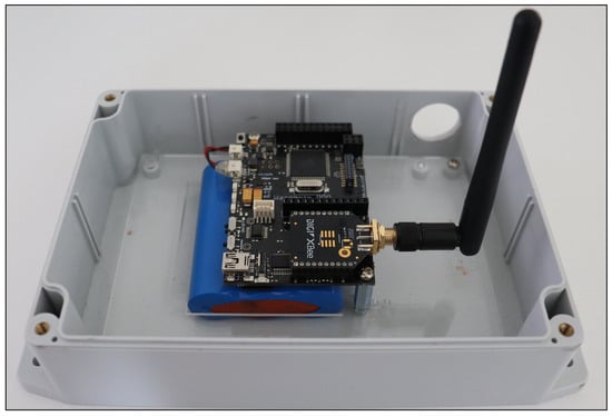 - Waspmote v1.5 development boards: The Waspmote v1.5 boards, designed for integration with various IoT technologies including ZigBee, were used to create up to five end device nodes. These boards operated on battery packs and were programmed via the Waspmote IDE software, allowing them to function autonomously. The end device (Waspmote) node is shown in Figure 5.