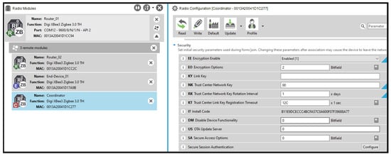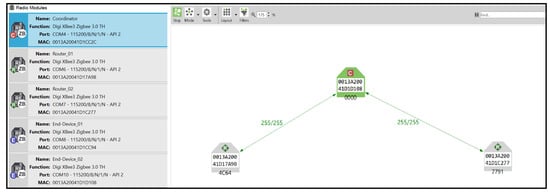 - XCTU: Digi XCTU is a comprehensive configuration and test utility software essential for updating, configuring, and managing the XBee 3 radio modules. XCTU facilitates the setting of node parameters, including network security configurations and policies, and other essential settings that determine node communication. The software connects locally to the XBee 3 modules via the USB interface of the XBee development boards. XCTU’s network scan function is particularly valuable for internal network monitoring, providing a graphical display of nodes, pathways, and their respective signal strengths. This function was employed to verify network formation and monitor changes during experiments. Additionally, XCTU’s frames generator tool was used to create and send custom API frames from locally connected XBee 3 modules, enabling the creation of any frame supported by the ZigBee 3.0 protocol and facilitating internal attack verification. Figure 6 shows an XCTU locally connected modules and network scan.