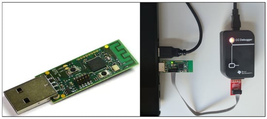 - CC2531 USB dongle: This device, flashed with ZBOSS sniffer firmware, was used to capture ZigBee network traffic over Wireshark. The CC2531 USB dongle and flashing ZBOSS firmware with CC Debugger are shown in Figure 8.