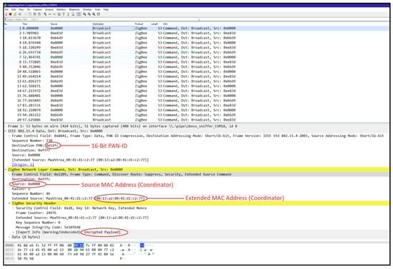Figure 10. Obtaining network information over Wireshark. - Monitoring join window: We monitored the network’s join window state using the zbstumbler tool, which indicated when the join window was open or closed on gateway nodes. Figure 11 shows the join window state being monitored, indicating that the join window is closed on the gateway nodes.