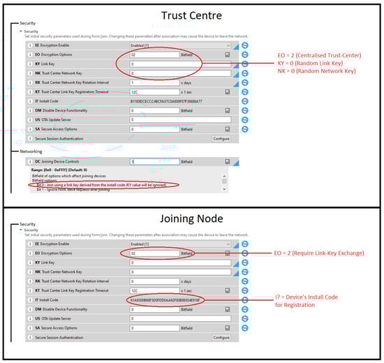 In essence, this technique fortifies the security of ZigBee 3.0 networks by ensuring that each device’s link key remains devoid of predictability or pattern. By eliminating the reliance on shared global keys, the network key is shielded from potential exposure. This pivotal practice contributes to the establishment of a resilient and secure network architecture, amplifying the overall protection against unauthorised access and potential key-based exploits. Figure 13 illustrates the configuration applied to the joining node and trust centre to enable joining via install codes.