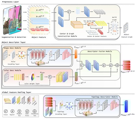 As a result, the generated descriptor is based on a hierarchical structure that simultaneously captures low-level features at the pixel level, mid-level representations such as object shape and color, and high-level features encompassing the semantic content and spatial layout of the scene.Such an integrated representation enables simultaneous support for various visual tasks, including visual odometry, object tracking, global re-localization, and scene clustering. It also serves as a foundational component for the complete automation of our previous work, Semantic Modeling Framework [3,6].
