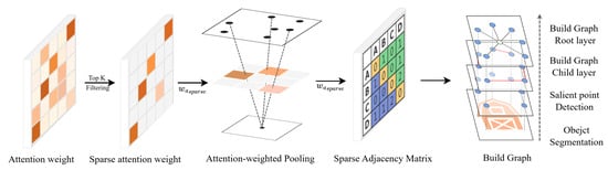 Instead of constructing a fully connected graph among all salient points, we apply a sparsely connected attention mechanism that selectively links only the most relevant pairs based on their importance. This approach helps reduce redundant computation and limits the risk of overfitting to local variations or noise. In the graph, directional edges are defined for both parent-to-child and child-to-child relationships, which allows the GNN to operate with fewer message-passing steps while maintaining a clear hierarchical information flow [59,60]. In our design, the object center is defined as the parent node, and salient points are treated as children. This hierarchical setup enables efficient message propagation by reducing redundant computation and enforcing structured information flow. To capture richer local context, additional child-to-child connections are selectively added based on attention weights, allowing semantically relevant features to interact without overburdening the graph. This dual-edge structure balances computational efficiency with representation expressiveness and was empirically found effective during experimentation. This process is illustrated in Figure 2, which visualizes the hierarchical graph structure consisting of the object center, directed edges to salient points, and selective child-to-child connections based on attention.