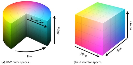 To encode visual appearance compactly and robustly, we design a color descriptor that uses normalized HSV color statistics. Unlike raw RGB values, the HSV color space decouples chromatic and intensity components, and it is more robust to lighting variations and shadows [66,67]. Most methods represent color using the RGB color space. However, RGB is not well aligned with human visual perception, particularly in capturing variations in hue. So, we adopt the HSV color space, which more effectively reflects perceptual color differences and better aligns with how humans perceive color. Figure 5 shows differences between the RGB and HSV color spaces and their respective approaches to color representation.