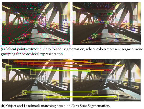 Recent deep learning-based methods, including SuperPoint [12], D2-Net [13], and R2D2 [14], offer improved keypoint stability and discriminative power. Although these approaches enhance matching performance, they are fundamentally limited by their reliance on local structures, which makes it difficult to incorporate global context or object-level semantic information. Dense matching, such as LoFTR and Patch2Pix, attempts to overcome keypoint sparsity by establishing pixel-wise correspondences [15,16].