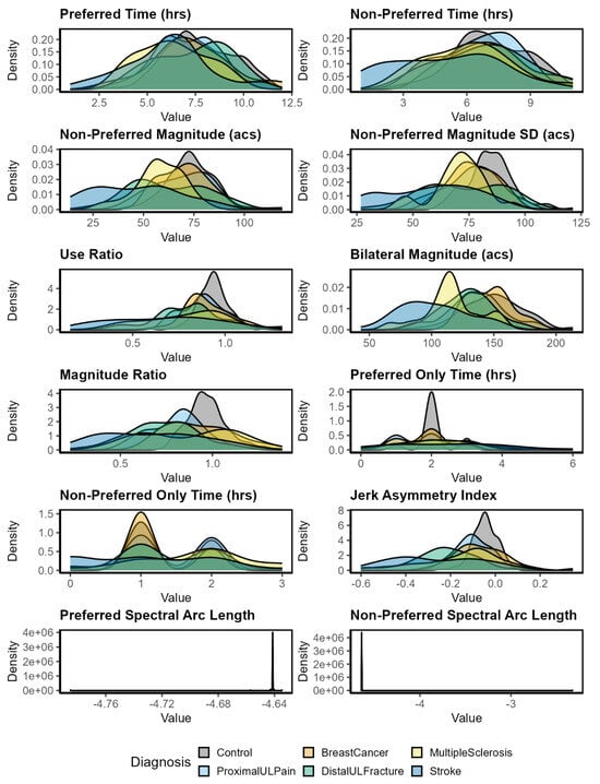 Principal components were derived from sets of accelerometry input variables (12, 9, 7, and 5). Prior to conducting PCAs, all accelerometry variables were standardized using z-scores due to different measurement scales (e.g., counts, hours, ratios). All 12 accelerometry input variables were then visualized in density plots stratified by diagnosis (Figure 1). To replicate work by Barth et al., 2021 [11], the PCA was conducted using the prcomp function as part of the stats [20] package on sets of 12, 9, 7, and then 5 accelerometry input variables, as indicated in the last column in Table 1. Accelerometry input variables were sequentially excluded from analyses according to computational complexity, validation in clinical populations, and clinical interpretation [11]. Additionally, each model had at least one accelerometry input variable from constructs of duration, intensity, variability, and symmetry to best capture the dimensionality of UL activity performance in daily life [11]. For each variable model (12, 9, 7, and 5), scree plots were evaluated to determine the appropriate number of PCs to explain variance among the accelerometry input variables. Importantly, because the sign of a PC is arbitrary, we manually set the direction of the PC to load positively on preferred time across all analyses (e.g., if the loading of PC1 on preferred time was negative, all loadings for PC1 were multiplied by −1). This alignment does not alter the internal structure of the loadings but ensures directional consistency across variable sets.