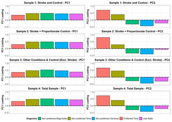 Replication of a five-variable, five-cluster solution in a sample of people with stroke and people without UL disability was confirmed. This analysis demonstrated the stability of original findings from Barth et al. (2021) [11] across two new samples of people with stroke and people without UL disability. Although both replication samples included the same conditions, their compositions differed substantially, which provided an opportunity to assess the robustness of the model across contrasting clinical profiles. Irrespective of sample composition (one sample had a higher frequency of people without UL disability than the other), two PCs consistently emerged from the data with comparable variance explained, and the five-variable, five-cluster model was preserved (samples 1 and 2, Table 4). Replication of the same solution suggests the findings are real, as many findings in the biomedical literature cannot be replicated [60,61], especially with statistical models such as the ones used here.