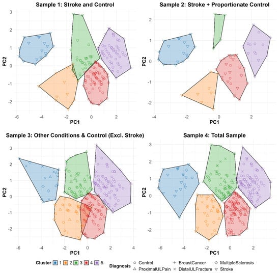 A five-cluster solution consistently explained the most overall variance in comparison to two-, three-, or four-cluster solutions for each sample in our analysis, regardless of the number of accelerometry input variables. Cluster statistics are shown in the last two columns of Table 4 and represented graphically in Figure 3. For samples that included participants with stroke and people without UL disability, the analyses replicated prior work [11]. AIC values (last column, Table 4) determined that a five-variable five-cluster solution provided the best model fit in comparison to the two-, three-, or four- cluster solutions across different accelerometry input variables (12, 9, 7 and 5). This held consistent across all samples. While each cluster solution (2-, 3-, 4-, 5-) was statistically feasible, the final, most parsimonious solution included five clusters, with five accelerometry input variables of non-preferred magnitude, non-preferred time, non-preferred variance, preferred time, and the use ratio, consistent with prior work. Figure 3 displays a five-variable, five-cluster solution within a two-dimensional PC space for each of the four samples in this analysis. The x-axis represents PC1, which captures overall UL activity, while the y-axis represents PC2, which represents the duration of preferred limb use. Each axis reflects a continuous gradient, with participants distributed according to their clustered UL performance profiles. To aid interpretation, consider the following examples in Figure 3: Cluster 1 (shown in blue) comprises individuals with high preferred UL use but low overall UL activity, suggesting limited engagement of the non-preferred limb in daily tasks, and likely greater severity of UL functional deficits. Cluster 5 (shown in purple includes individuals with both high preferred UL use and high overall UL activity, consistent with more symmetrical and frequent UL use throughout the day, and likely less severe or no impairments. Cluster 2 (shown in orange) consists of individuals with low preferred UL use and low-to-moderate overall UL activity, indicating either impairment with the preferred UL, or reduced overall upper limb engagement. Overall, clusters show remarkable similarities across each sample, despite differing compositions of clinical populations and severity of functional deficits.