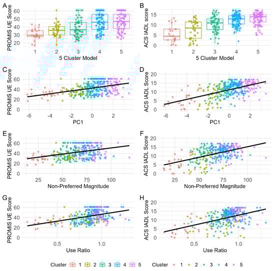Scatterplots of convergent validity analysis. (A) Scatterplot of PROMIS UE score and 5 Cluster Model. (B) Scatterplot of ACS IADL score and 5 Cluster Model. (C) Scatterplot of PROMIS UE and PC1 (which represents overall UL activity performance). (D) Scatterplot of ACS IADL score and PC1 (which represents overall UL activity performance). (E) Scatterplot of PROMIS UE score and Non-Preferred Magnitude. (F) Scatterplot of ACS IADL score and Non-Preferred Magnitude. (G) Scatterplot of PROMIS UE score and Use Ratio. (H) Scatterplot of ACS IADL score and Use Ratio. Abbreviations: ACS IADL score, Activity Card Sort–Instrumental Activities of Daily Living score; PC, principal component; PROMIS UE Score, Patient-Reported Outcome Measurement Information System Score for the Upper Extremity.