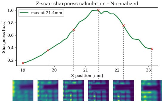 Figure 3 illustrates one experimental example of the evolution of acquired image sharpness along the z-scan, showing peak sharpness at approximately z ≈ 21.4 mm. This position is subsequently used to scan the larger sample area.