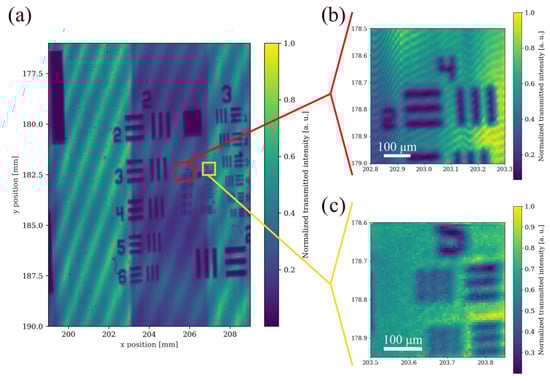 In order to assess the resolution limit of the setup, we scanned the smaller regions around groups 4 and 5 in Figure 4b,c, respectively, using a smaller scan step of 5 µm. We have good 2D resolution for feature sizes that span from tens of millimetres to around a couple of tens of micrometres, such as group 4 element 2, which has a line width of 31 µm. While we can qualitatively still differentiate smaller features in the case of group 5 elements 1 and element 2, which have line widths of 15.63 µm and 13.92 µm, respectively, we are limited by the resolution limit of the current system, which has a beam waist diameter of 26 µm.
