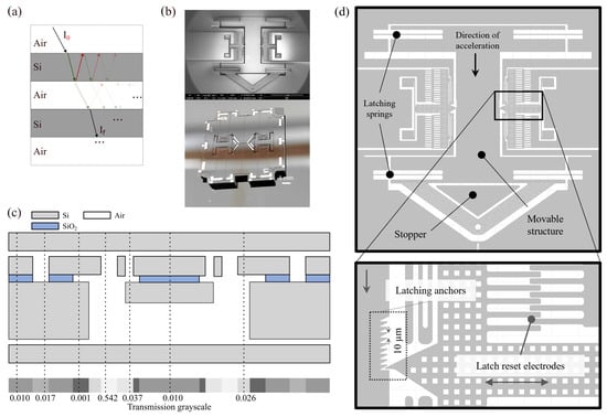 Once the performance of the optical inspection system was validated, we used our experimental setup to inspect an encapsulated latching MEMS device, illustrated in Figure 5b,d. Latching mechanisms are commonly used in inertial MEMS switching devices designed to detect an external acceleration above a pre-established threshold. When this acceleration is applied to the movable structure and exceeds the threshold value, it moves towards a fixed contact, closing the electrical circuit. However, during shock impacts, the contact time is usually extremely low, making it difficult to detect an electrical signal arising from this mechanical contact. Therefore, the latching mechanism is employed as a switch that is triggered when the external acceleration surpasses the threshold and remains in that state until a reset is performed. Figure 5d illustrates the details of the latching mechanism. The central movable structure is susceptible to the external downwards acceleration, countered by the latching spring forces. Latching anchors provide multiple stable positions at 10 µm step intervals, which provide linearly-spaced acceleration thresholds. The latching mechanism can be reset through electrostatic actuation, where a voltage signal applied to the electrodes provides a lateral force that dislodges the latching anchor, releasing the movable structure to move back to its initial position. The devices were fabricated in an in-house 4-mask 50 µm-thick SOI wafer bulk micromachinning process, similar to the process described in []. This MEMS microfabrication process includes metal patterning for the electrical pads, and patterning of the device layer by DRIE (Deep Reactive Ion Etching), forming features with sizes ranging between 2.25 µm and 80 µm. In addition, an extra handle proof-mass is created by etching an 80 µm-wide path surrounding the mass through DRIE on the handle layer, which is then thinned. Preliminary analysis on the feature size and general operational status of the structures was made beforehand with SEM.
