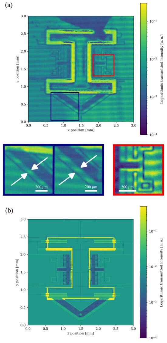 (a) Experimental measurement of the encapsulated MEMS device using the infrared scanning inspection setup. Red inset shows the fine details around a structured region. Blue inset shows the difference between the bigger gap in a latched mechanism (left) and the one visible on a non-latched (right). (b) Theoretically modelled transmittance map of the same device structures.
