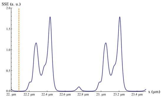 Representation of the evolution of the SSE with the air-gap dimension, represented by x. The vertical orange line indicates the minimum value of SSE around 22 µm of air-gap.