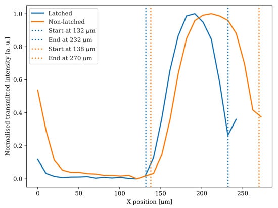 Transmittance profiles for the latched (blue) and non-latched (orange) devices, across the line formed by the arrows in Figure 6a. The vertical dashed lines represent the start and end of the feature under comparison in both cases, indicating an thinner feature size for the latched device.