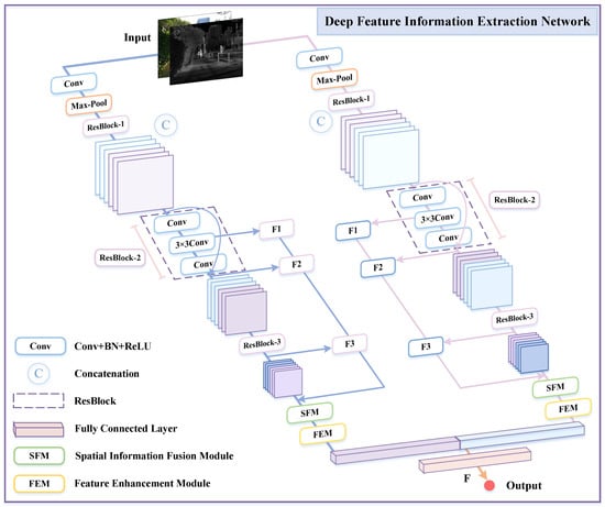 Neural networks can efficiently learn various features of images through a large number of samples. The descriptors of feature points are typically represented by the outputs of specific layers in a convolutional neural network (CNN), thereby significantly simplifying the complex feature extraction process. ResNet, as a typical representative of CNN, has demonstrated outstanding performance in image feature extraction, classification, and object recognition tasks [18]. Although ResNet-50 and ResNet-101 are widely adopted in research, ResNet-101 is limited in practical applications due to its high computational complexity and time cost. Therefore, this paper selects the moderately deep ResNet-50 as the core network of the deep feature extraction module and optimizes its structure, proposing a deep feature information extraction network (DFEN), as shown in Figure 2. Specifically, this module uses only three residual blocks to reduce the computational complexity of the network. After the ResBlock-3 output, an SFM based on spatial pyramid pooling is introduced. Regardless of changes in the input image size, the SFM generates fixed-size outputs, significantly enhancing the scale invariance of the image and effectively reducing the risk of overfitting.