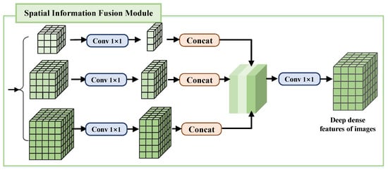 The extracted features of different scales are cascaded and fed into a spatial information fusion module containing a three-layer feature pyramid. This module adopts a multi-scale pooling kernel design, achieving feature extraction from different subregions through a simplified operation process. Therefore, it is necessary to reasonably set the size of the pooling kernels between adjacent layers. In this paper, the pooling operators in the SFM are set to 1 × 1, 2 × 2, and 4 × 4, and pooling operations are performed on the input feature maps to generate three feature maps of different scales, with sizes being one-quarter, one-half, and the original size of the input feature map, respectively. To preserve the significance of global features, a 1 × 1 convolution layer is introduced after each pyramid level to reduce the feature size to one-third of the original size. Next, the dimensionless multi-scale feature maps are upsampled using different scaling factors to restore them to the same size as the input feature maps and then concatenated along the channel dimension. Finally, the concatenated feature maps are fused along the channel dimension using a 1 × 1 convolution kernel, thereby aggregating multi-scale spatial context information.