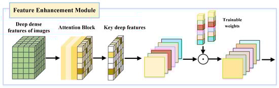 The FEM maps the overall feature vectors of the input image and then analyzes the intrinsic dependencies between feature vector sequences to effectively extract and integrate global information. The deep dense features of the image output by the SFM are used as input for the FEM, where the input is represented as , with being the i-th feature vector. Through the learnable weight matrices , , and , the input sequence is mapped to query, key, and value vectors, respectively:
