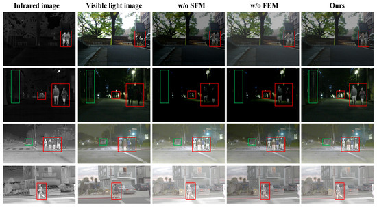 Visualization of the ablation experiment results. Red boxes indicate people. Green boxes indicate objects such as streetlights, vehicles, etc.
