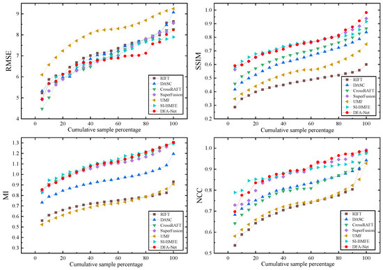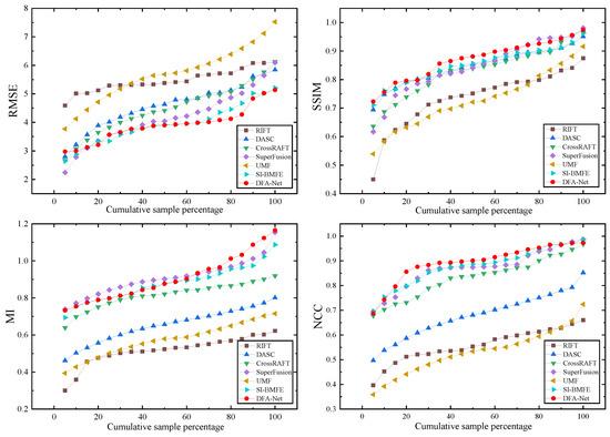 As shown in Table 4 and Table 5, this paper compares DFA-Net with six mainstream methods on the MSRS and RoadScene datasets. The best results are marked in red, and the second-best results are marked in blue. In terms of quantitative analysis, the RMSE, SSIM, MI, and NCC values of DFA-Net on the two datasets are 3.910, 0.871, 0.906, and 0.894; and 6.782, 0.752, 1.099, and 0.893, respectively. Figure 6 and Figure 7 detail the distribution of the four metrics across methods as the sample proportion increases.