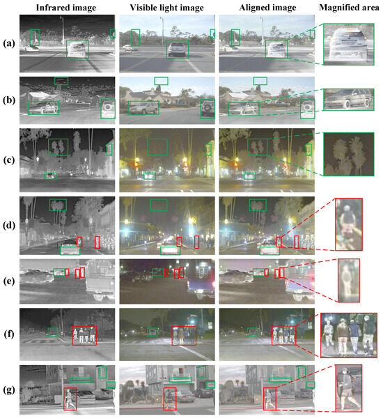 Image alignment visualization results on the MSRS dataset. Red boxes indicate people, green boxes indicate environmental references such as vehicles, streetlights, etc. (a–c) highlight the spatial alignment effect of pedestrian targets; (d–f) verify the accurate alignment of multi-level targets in composite scenes of people and backgrounds; and (g) shows the alignment effect of vehicle targets.