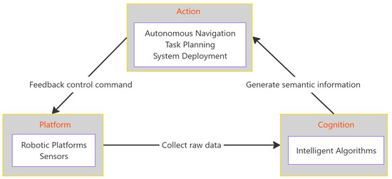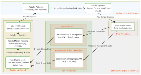 As illustrated in Figure 1, the proposed framework deconstructs the robotic inspection system into three interconnected modules. The Physical Platform, reviewed in Section 2, represents the hardware (robots and sensors) that serves as the system’s interface with the physical world. The Cognitive Core, the focus of Section 3, encompasses the algorithms that process sensor data for tasks like crack detection, acting as the system’s brain. Finally, Autonomous Action, detailed in Section 4, involves the high-level planning and navigation strategies that translate cognitive understanding into purposeful movement. The framework highlights that a system’s overall effectiveness arises from the seamless integration and synergy among these modules. Building on this integrated view, Section 5 analyzes the core challenges and future technological trends, and Section 6 concludes the study.