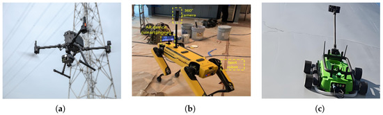 - Ground robots typically possess the greatest payload capacity and endurance, often serving as mobile base stations or for inspecting ground-level cracks. They are adapted to different terrains through wheeled, legged, or hybrid (e.g., leg–wheel–track [48]) locomotion systems. In recent years, legged platforms, particularly quadruped robots, have gained significant attention for their exceptional dynamic stability and obstacle-crossing capabilities [49]. In practical applications, ground robots frequently act as hubs for heterogeneous collaborative systems. For instance, a ground robot might inspect road surface cracks on a bridge deck while simultaneously serving as a mobile base station to provide differential Global Navigation Satellite System (GNSS) signals and charging for UAVs inspecting the bridge’s towers.