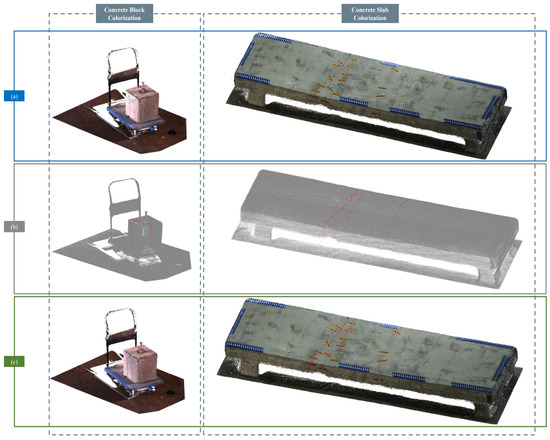 SLAM-based 3D reconstruction and crack localization [122]. (a) 3D point cloud generation using LiDAR SLAM; (b) Fusion of color data from visual camera to produce a textured 3D model; (c) Overlay of crack detection results onto the 3D model with global spatial coordinates.