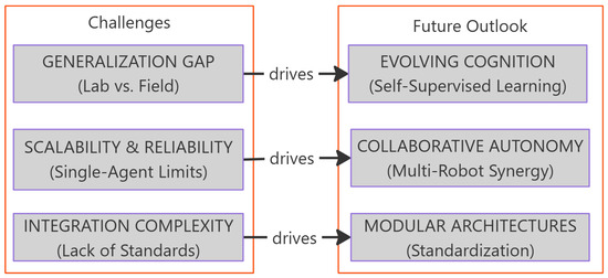 The preceding sections have analyzed the three core modules of a robotic inspection system: the physical platform, the cognitive core, and autonomous action. However, when this sophisticated technological system transitions from the laboratory to large-scale field applications, the inherent limitations of each module are amplified by real-world complexities, creating the core challenges that currently face the field. A deep understanding of the roots of these challenges is the logical starting point for discerning future research directions. This section examines these challenges through the lens of existing literature and looks toward future technological trends, as illustrated in Figure 5.