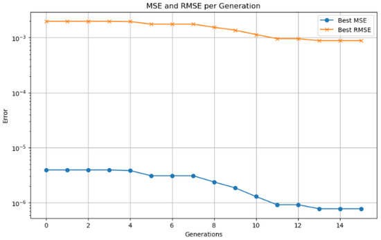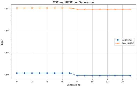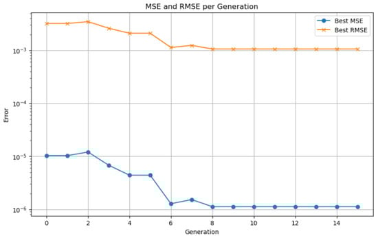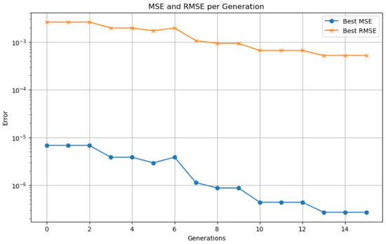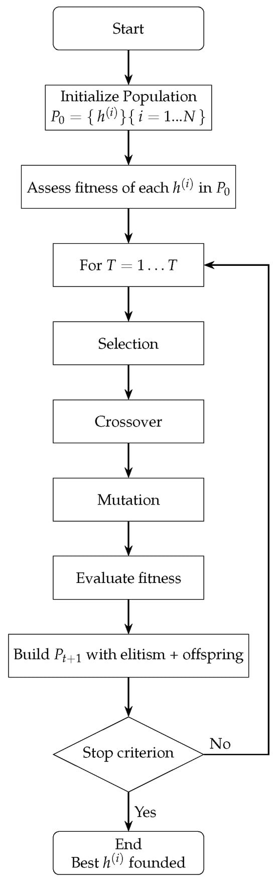 The population is replaced by a combination of the best individuals (elitism) and the new offspring generated by crossover and mutation. In Equation (13), the algorithm stops when a stopping criterion ( is a small threshold) is met, such as reaching a maximum number of iterations or achieving a minimal improvement in the fitness function [].
