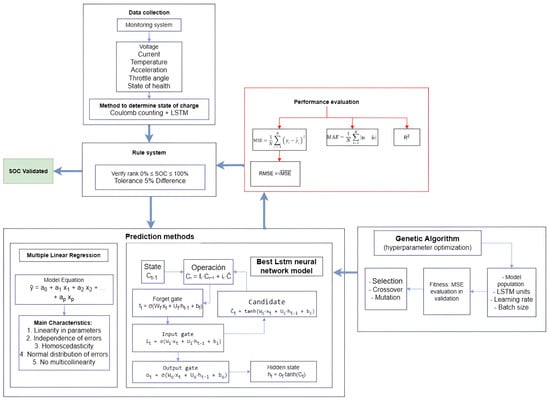 Accurate estimation of the state of charge in medium- and high-voltage batteries is essential to ensure the performance and safety of electric vehicles. However, the nonlinear and dynamic characteristics of batteries make this task particularly challenging under varying operating conditions, as noted by Plett et al. []. A first group of studies adopts model-based approaches that rely on physical representations of battery dynamics, primarily using Kalman filters and equivalent circuit models (ECMs). In the study by Manríquez et al. [], long short-term memory (LSTM) neural networks were proposed to model these temporal complexities due to their ability to capture long-term dependencies in sequential data. Furthermore, optimizing LSTM models using genetic algorithms (GA) has been shown to improve estimation accuracy.