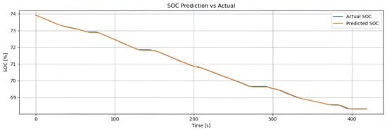 In a work by Oka et al. [], an LSTM-based battery emulator was developed to predict the charging and discharging behavior of lithium-ion batteries (LIBs). The model was trained using both simulated data (via Dualfoil) and experimental data to forecast voltage profiles under galvanostatic conditions. The emulator demonstrated high accuracy, achieving coefficients of determination () of 0.98 with simulation data and 0.97 with experimental data.