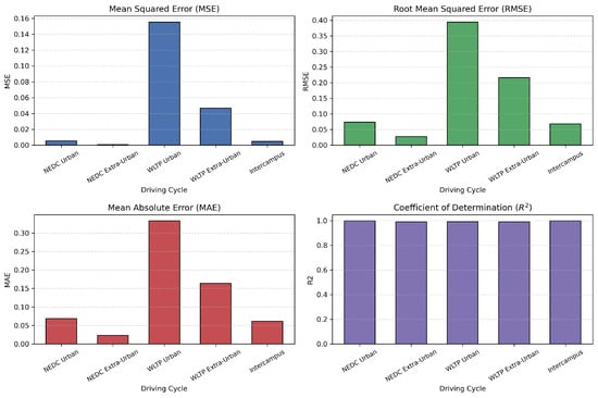 In a work by Gupta et al. [], an electric vehicle was modeled and simulated in MATLAB/Simulink R2024b under various driving cycles. The resulting data were used to train a neural network for SoC estimation, initially using the coulomb counting method. After optimization with 40 neurons, the neural network achieved estimation errors below 1% for the Worldwide Harmonized Light Vehicles Test Procedure (WLTP-3) and below 3% for the Los Angeles 1992 (LA92) driving cycle.