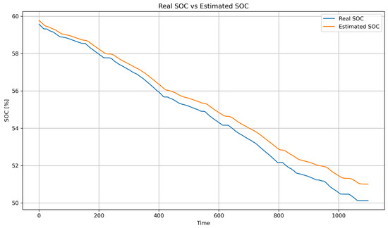 Finally, several comprehensive or hybrid studies integrate multiple methodologies, offering comparative evaluations or extending SOC and SOH estimation beyond lithium-ion chemistries, such as sodium-based batteries. For instance, in the study by Xiang et al. [], experimental tests were conducted on commercial sodium-ion batteries (SIBs) using a third-order equivalent circuit model, which was optimized through a particle swarm optimization algorithm for accurate SoC estimation. Three model-based approaches were evaluated: the extended Kalman filter (EKF), the unscented Kalman filter (UKF), and the particle filter (PF). Among them, the UKF demonstrated the highest accuracy, with mean absolute error and mean squared error values below 1.2% and 1.6%, respectively.