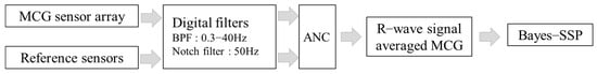 After noise cancellation using ANC, we performed further signal-processing procedures consisting of signal averaging and noise reduction. First, the peaks of the R waves were detected in simultaneously recorded ECG, and MCG data after ANC were signal-averaged based on the detected R wave timings. Subsequently, a novel noise reduction method termed Bayesian signal space projection (SSP) was applied to the averaged MCG waveforms. The empty room noise data were used to identify the spatial characteristics of the noise to be discriminated from the MCG data. This algorithm was based on a model expressed using the following formula: